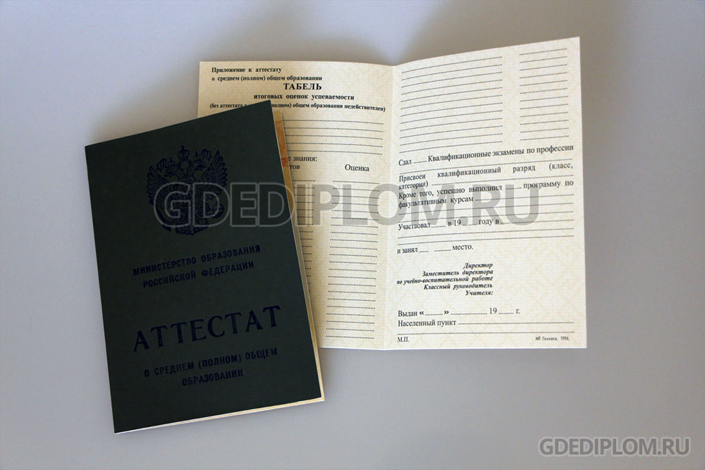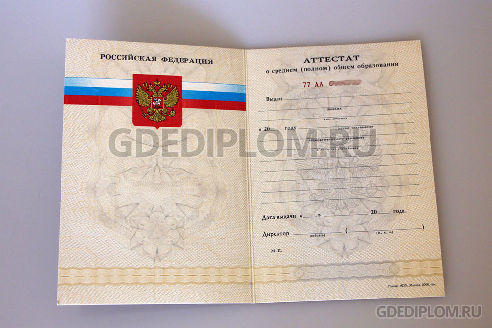 Продажа аттестатов любой школы России. Изготавливаются на защищенных бланках государственного образца. В комплект каждого документа входит: бланк аттестата, вкладыш (приложение), твердая обложка синего цвета. Заполняем по государственным стандартам, актуальным на нужный Вам период, заверяем печатью, подписью директора и других ответственных лиц. Ознакомьтесь с описанием, фотографиями и ценами документов ниже. Подходят для поступления в ВУЗы, ССУЗы, принимающие на базе 11 классов, а также для предъявления по месту требования!
